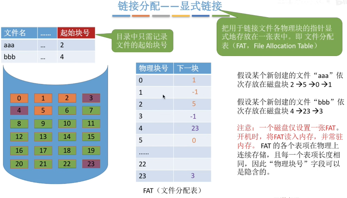 在显式链接中,所有的指针被提取出来,存放在一张集中的表中(FAT表,File Allocation Table)。关键点在于:系统启动时,这张表通常会被加载到内存中。