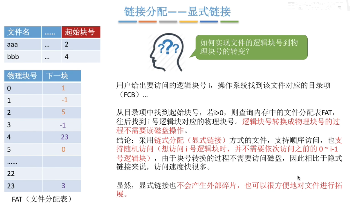 虽然显式链接(如 FAT 文件系统)在理论数据结构上仍然是“链表”(意味着你需要顺藤摸瓜),但由于这个链表被提取出来单独存放在内存中,因此在实际效果上,它实现了(近似的)随机访问。