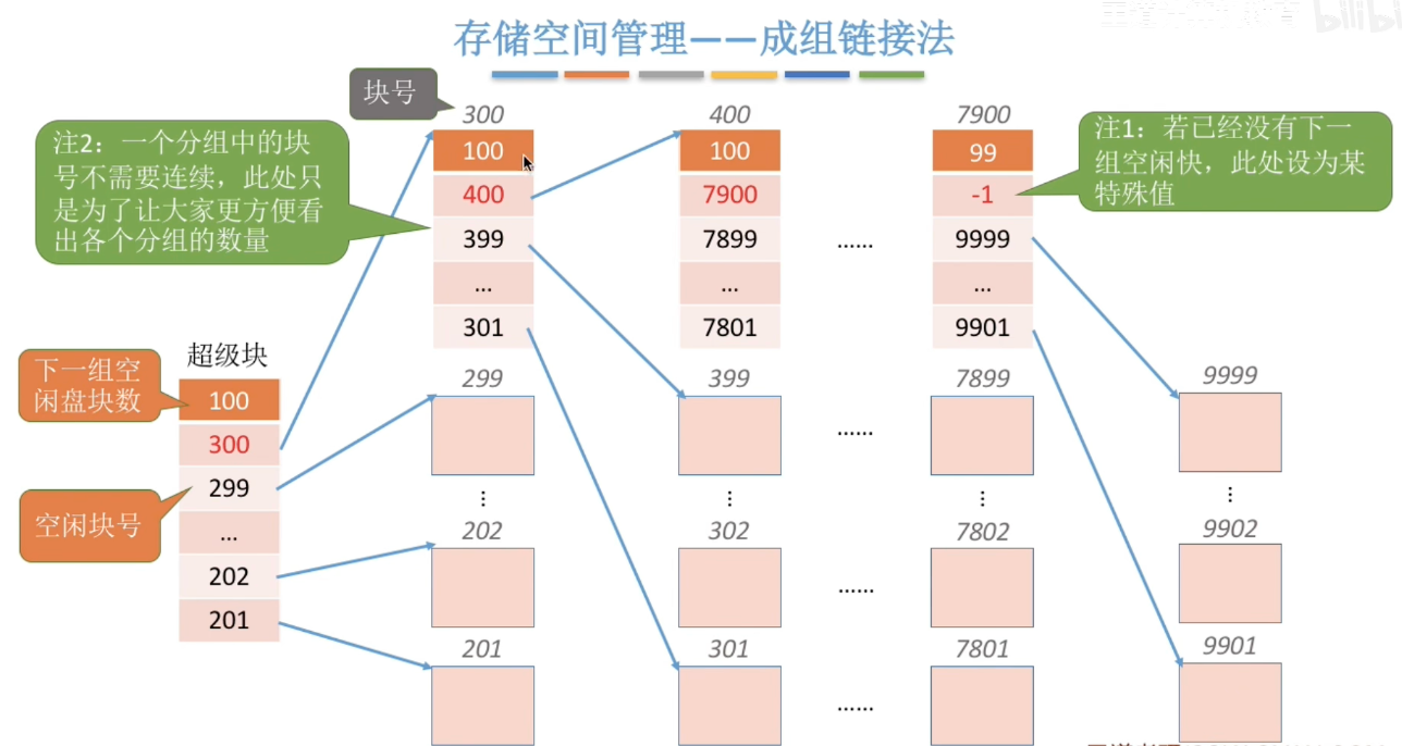 回收:假设上限100,现在回收1块,新增一个分组作为超级块,第一个指向老的超级块,第二个是新的回收的1块